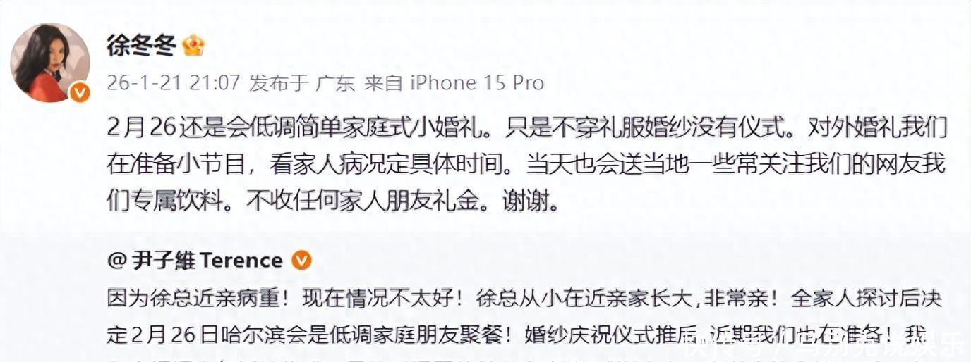 清晨的网络总是藏着许多让人猝不及防的话题。当大家刚刚刷着热搜,徐冬冬那句“谁送礼金就请谁回家”已经点燃了一场讨论。从哈尔滨寒冬里的婚礼计划到突然按下的暂停键,这背后显然不只是明星八卦那么简单。新人的名字本身带有不小流量,但更让大家停下脚步的是他们的选择:不收礼,不办盛大婚宴。有人拍手叫好,也有人觉得不可理喻,这种“反人情”的操作,其实和现实里无数有压力的新人家庭息息相关。事情发酵得很快。1月22日凌晨5点,徐冬冬公开说,原本安排在2月26日的婚礼必须缩减,只举行小型家庭仪式,原因是家中长辈旧疾加重,她亲口形容从大爷那里感受到亲情如父。1月21日,她已经预告,婚礼不会收任何形式的礼金,还专门准备了尹子维和自己的特别版椰树饮料,算是一份心意。她反复强调:“不管是谁,只要你送礼,请回家,这次我要说‘抱歉’,但也感谢。”